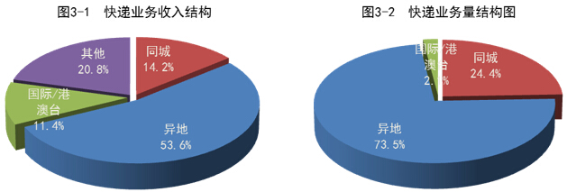 1-7月份,同城、異地、國際/港澳臺快遞業務收入分別占全部快遞收入的14.2%、53.6%和11.4%;業務量分別占全部快遞業務量的24.4%、73.5%和2.1%。與去年同期相比,同城快遞業務收入的比重下降0.1個百分點,異地快遞業務收入的比重下降1.2個百分點,國際/港澳臺業務收入的比重下降2.9個百分點。