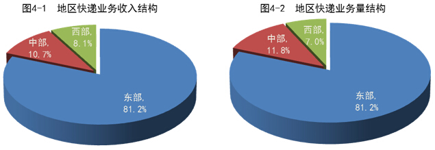 1-7月份,東、中、西部地區快遞業務收入的比重分別為81.2%、10.7%和8.1%,業務量比重分別為81.2%、11.8%和7.0%。與去年同期相比,東部地區快遞業務收入比重下降了0.5個百分點,快遞業務量比重下降了0.4個百分點;中部地區快遞業務收入比重上升了0.3個百分點,快遞業務量比重上升了0.4個百分點;西部地區快遞業務收入比重上升了0.2個百分點,快遞業務量比重持平。