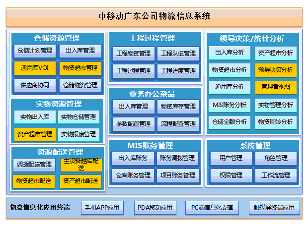 中國移動通信集團廣東有限公司(以下簡稱廣東移動)于1998年1月正式注冊成立,是中國移動(香港)有限公司在廣東設立的全資子公司,近三年公司業務收入超700億元、納稅超百億元;廣東移動是我國信息通信行業中規模最大的省級公司、也是廣東省最大的通信運營商,下設21個地級市分公司,省、市公司均設置物流管理專職機構,廣東移動是中國移動關于物流管理理念最先進、信息化程度最高的子公司之一,并連續四年榮獲全集團供應鏈規劃一等獎及物流管理標桿稱號;同時,獲中國物流與采購聯合會物流信息化應用杰出企業稱號,并連續兩年榮獲中國物流與采購聯合會物流信息化優秀案例獎。