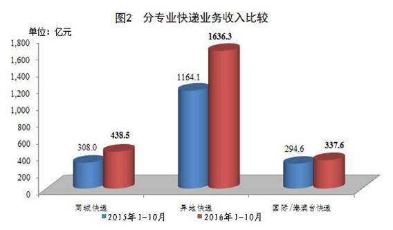 1-10月份,同城、異地、國際/港澳臺快遞業務收入分別占全部快遞收入的14.2%、53.1%和11%;業務量分別占全部快遞業務量的24%、74%和2%。與去年同期相比,同城快遞業務收入的比重下降0.3個百分點,異地快遞業務收入的比重下降1.5個百分點,國際/港澳臺業務收入的比重下降2.8個百分點。