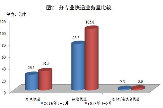 1-5月,全國快遞服務企業業務量累計完成139.1億件,同比增長30.3%;業務收入累計完成1761.3億元,同比增長26.7%。其中,同城業務量累計完成32.3億件,同比增長23.8%;異地業務量累計完成103.8億件,同比增長32.6%;國際/港澳臺業務量累計完成3億件,同比增長27.7%。