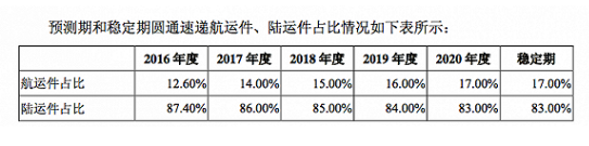 2015年,航空運(yùn)輸總量占總包裹量的11%,其中自有運(yùn)力的運(yùn)輸量“占總需求量的比例極低”。根據(jù)圓通的招股書預(yù)測(cè),2020年開始圓通的航運(yùn)件占比將達(dá)到17%,達(dá)到穩(wěn)定期。