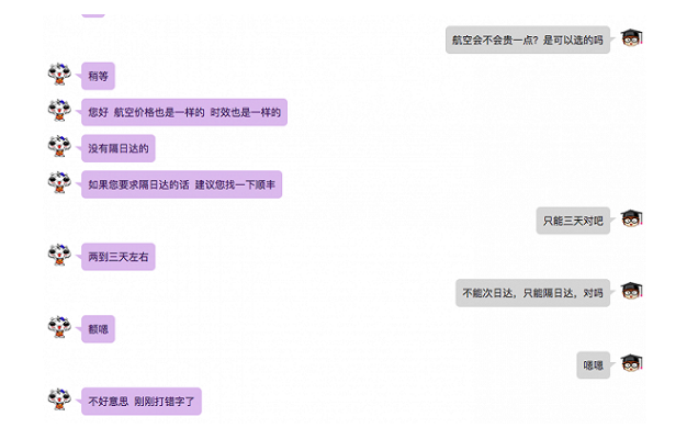 而圓通航空的時(shí)效產(chǎn)品一直沒有做起來。對(duì)比圓通和順豐公布的航空線路,以一條順豐的南京-深圳、圓通的一條成都-北京為例,其中順豐次日達(dá)為23元、隔日達(dá)為18元;而界面新聞?dòng)浾咦稍儓A通網(wǎng)點(diǎn)得知,圓通只有一種15元的隔日達(dá)產(chǎn)品。該客服表示,航運(yùn)與陸運(yùn)均為隔日達(dá)(三天),價(jià)格也一樣,這意味著飛機(jī)并沒有產(chǎn)生差異化的產(chǎn)品。