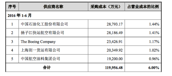 早在2003年,順豐控股與揚(yáng)子江快運(yùn)航空有限公司簽訂合同。根據(jù)順豐的招股書顯示,2016年上半年揚(yáng)子江快運(yùn)航空(現(xiàn)金鵬航空)位列順豐五大供應(yīng)商第二,采購成本占營(yíng)業(yè)成本的1.41%。