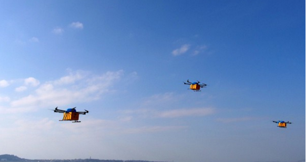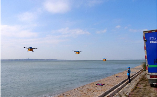 2017年10月31日,福建省莆田市山亭鎮,阿里巴巴菜鳥網絡的無人機群組,滿載湄洲島居民下單的六箱貨品,僅耗時9分鐘就成功飛越海峽,為農村淘寶提供物流服務。