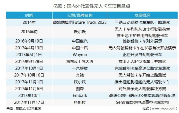 特斯拉的Semi無人卡車將到2019年開始量產。普華永道《2017年數字化汽車報告》預測,全無人駕駛要到2027年才能實現。但是在卡車界,讓自動駕駛自動駕駛卡車駛上公路商用化已經開始用個位數年倒計時。