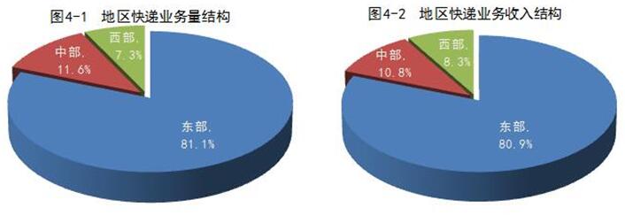 1-11月,東、中、西部地區快遞業務量比重分別為81.1%、11.6%和7.3%,業務收入比重分別為80.9%、10.8%和8.3%。與去年同期相比,東部地區快遞業務量比重基本持平,快遞業務收入比重下降了0.3個百分點;中部地區快遞業務量比重下降了0.2個百分點,快遞業務收入比重上升了0.1個百分點;西部地區快遞業務量比重上升了0.2個百分點,快遞業務收入比重上升了0.2個百分點。