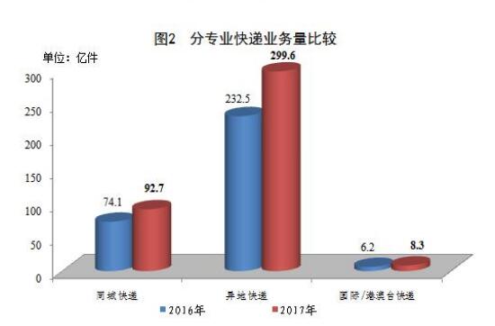 2017年,同城、異地、國際/港澳臺快遞業務量分別占全部快遞業務量的23.1%、74.8%和2.1%;業務收入分別占全部快遞收入的14.8%、50.7%和10.7%。與去年同期相比,同城快遞業務量的比重下降0.6個百分點,異地快遞業務量的比重上升0.5個百分點,國際/港澳臺業務量的比重上升0.1個百分點。