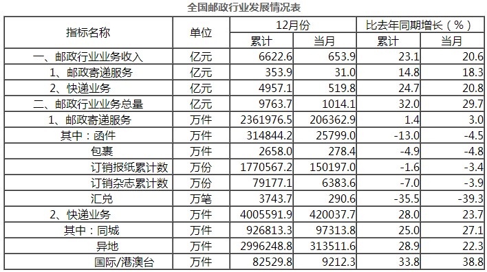12月份,郵政服務業務總量完成159.1億元,同比增長30.4%;郵政寄遞服務業務量完成20.6億件,同比增長3%;郵政寄遞服務業務收入完成31億元,同比增長18.3%。