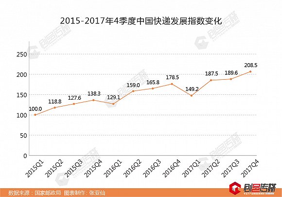 另外,國家郵政局1月12日發(fā)布的《2017年四季度中國快遞發(fā)展指數(shù)報告》顯示,2017年四季度,中國快遞發(fā)展指數(shù)為208.5,同比提高16.8%;普及指數(shù)為165.6,同比提高9.9%,環(huán)比提高7%,快遞的普及程度整體呈現(xiàn)穩(wěn)步提高態(tài)勢,快遞準(zhǔn)公共服務(wù)屬性凸顯。
