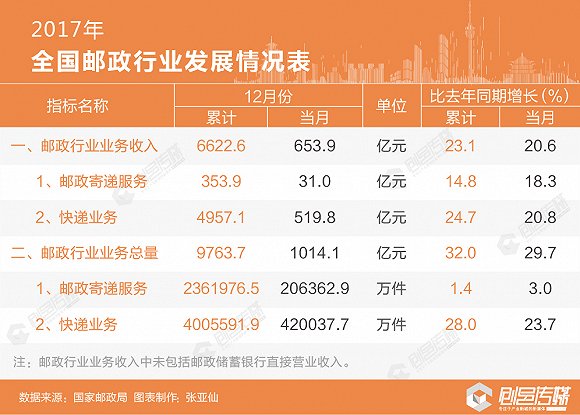 郵政作為快遞行業(yè)的重要力量,每年的業(yè)務(wù)量和收入都在增加。具體數(shù)字:2017年,郵政行業(yè)業(yè)務(wù)收入(不包括郵政儲蓄銀行直接營業(yè)收入)累計完成6622.6億元,同比增長23.1%;業(yè)務(wù)總量累計完成9763.7億元,同比增長32%。