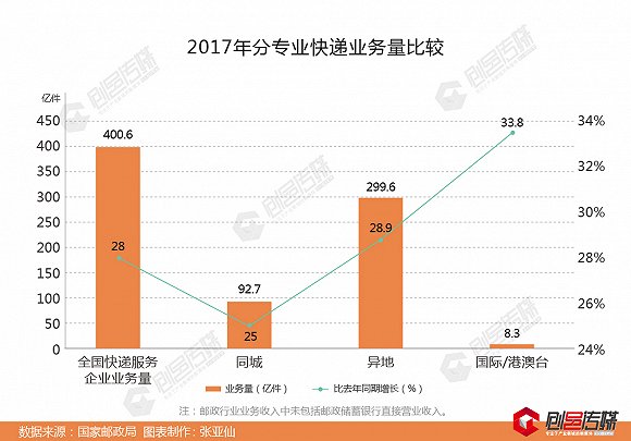 從寄達(dá)方向來看,同城快遞、異地業(yè)務(wù)、國際港澳臺都呈現(xiàn)增長的態(tài)勢,說明目前的快遞業(yè)務(wù)區(qū)域分布比較均衡。2017年,全國快遞服務(wù)企業(yè)業(yè)務(wù)量累計完成400.6億件,同比增長28%;業(yè)務(wù)收入累計完成4957.1億元,同比增長24.7%。其中,同城業(yè)務(wù)量累計完成92.7億件,同比增長25%;異地業(yè)務(wù)量累計完成299.6億件,同比增長28.9%;國際/港澳臺業(yè)務(wù)量累計完成8.3億件,同比增長33.8%。