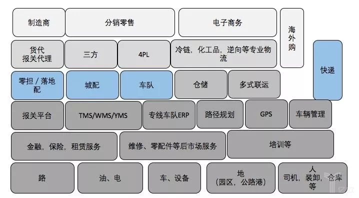 從下往上數第三層是崔牛會里很多牛油都在做的事情,比如:報關平臺、tms、ERP、設備管理系統、GPS定位服務等。