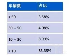 這張圖是根據我之前東家的數據來的——大概有4萬多家運輸企業的數據。在這4萬多家運輸企業里,大于50臺車的占3.58%,有30到50臺車的占4%,有10到30臺車的為8.99%,小于10臺的則是83.35%。