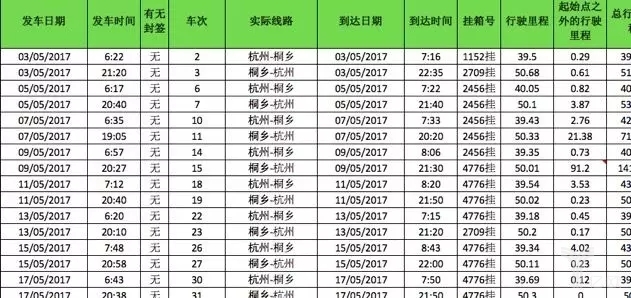 這個車隊主要是整車運輸的,大家可以看到,它記錄的是:每天哪趟車從哪兒到哪兒、出發時間、到達時間、行駛里程、路上開銷等等。