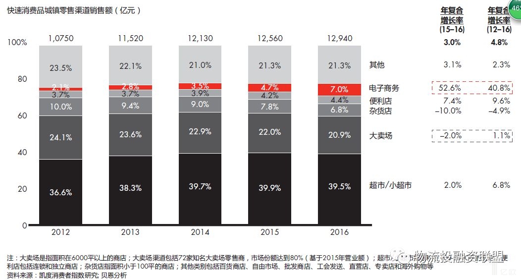 近年來,實體店受到網絡零售巨大沖擊,雜貨店、大賣場等實體經營場所入困難,趨于飽和狀態,發展遇到瓶頸,如圖3-3所示,快速消費品城鎮零售銷售渠道中,電商和便利店保持強進增長勢頭,而但大賣場的增長放緩,甚至出現下滑。消費需求變化推動零售企業以消費者為中心加大轉型力度,積極調整經營模式和業態布局。電商企業逐步認識到消費者現場購物體驗及物流到貨的服務體驗越來越重要,因此,實體零售與網絡電商正逐步從獨立、對抗走向融合、協作,深度融合是優勢互補、實現共贏的發展方向。阿里巴巴牽手三江購物、銀泰百貨、百聯集團,沃爾瑪、永輝超市引入京東,線上線下企業合作互動頻繁,有助于實體零售企業提高信息化水平,將線下物流、服務、體驗等優勢,與線上商流、資金流、信息流融合。