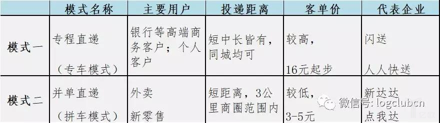 “眾包即時直遞”可細分為兩種模式,一種為“專程直遞”模式,一種為“并單直遞”模式,區別見下表。