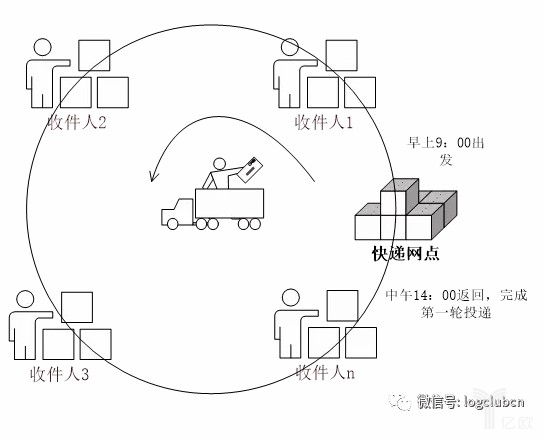 固定的投遞員在固定時間從固定的末端網點取貨,按照相對固定的投遞線路,在相對固定的區域進行投遞,是“一點取貨,多點投遞”的milk run模式的按時(計劃)投遞,可以事先計劃安排,實現最優分配,理論上是確定條件下的路徑最優化問題。
