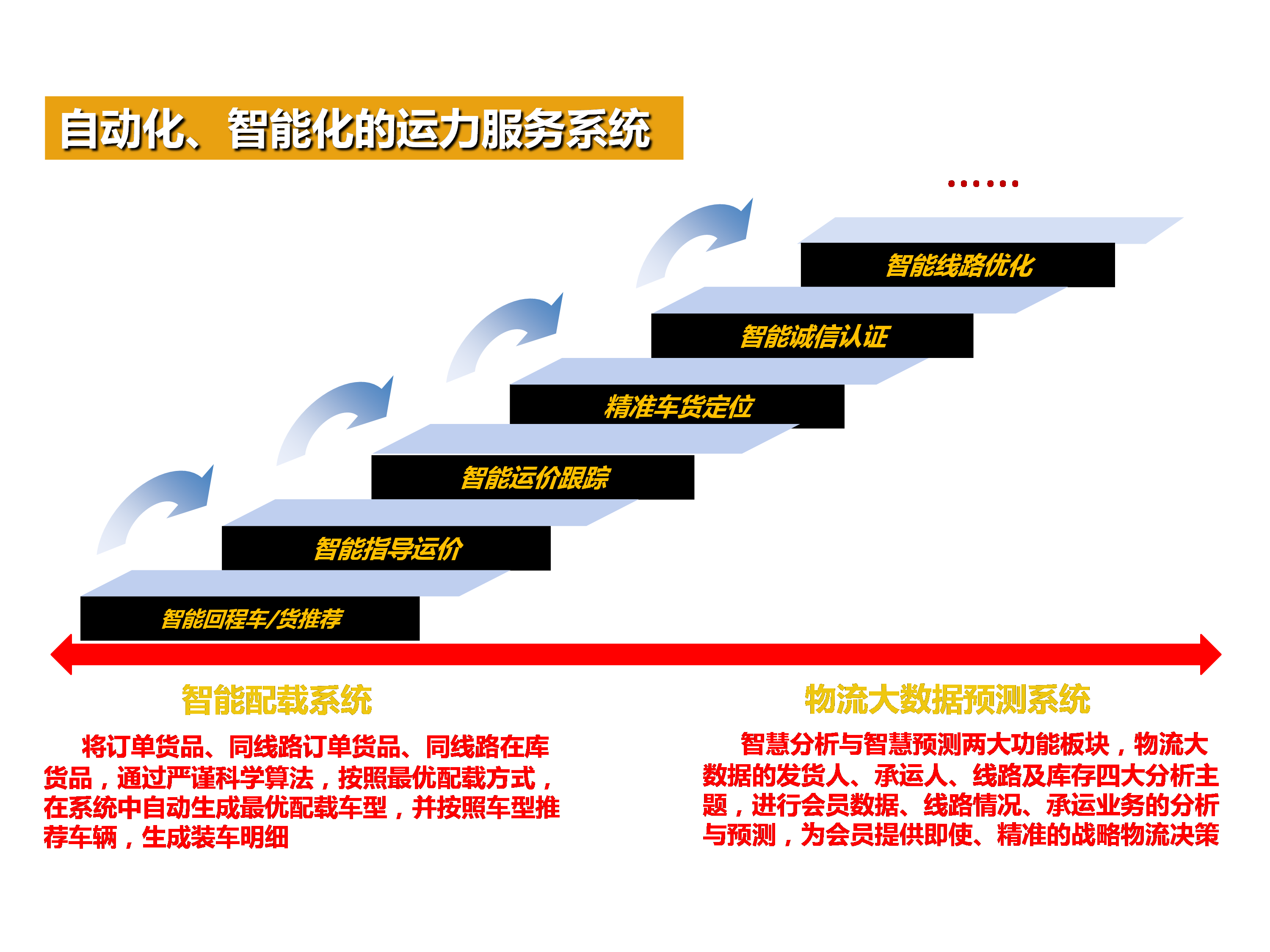 智能化是運力通平臺的技術優勢和應用亮點。運力通平臺充分利用大數據、云計算、數據挖掘等技術,構建智能化的運力服務系統平臺,通過技術來實現貨源、車源、司機等的高效聚集、信息對接、供求撮合。具體而言,平臺將逐步開發和應用智能運價指導、智能運價跟蹤、精準車貨定位、智能誠信認證、智能回程車/貨、智能線路優化等服務系統。