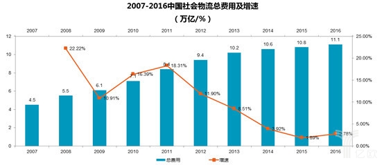 盡管物流行業發展競爭激烈,但社會物流總費用一直保持增長,2016年達到11.1萬億元,市場規模巨大。從數據可以看到,受宏觀經濟形勢影響,2011-2015年全國社會物流總費用增速有所下降,2015年迎來增速拐點。可以預見,中國作為新興經濟體,物流市場規模仍將持續擴大。