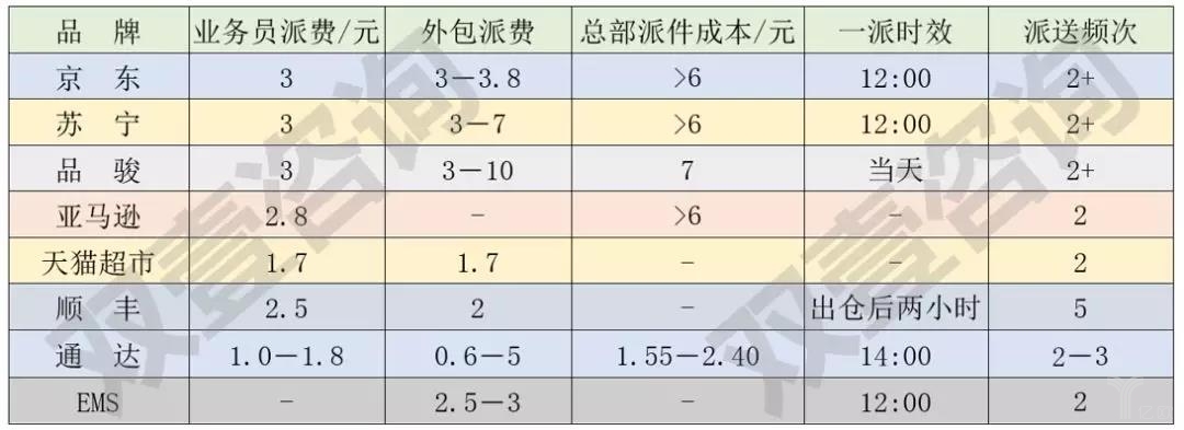 在快遞市場中占比最大的電商件,阿里的占比由前幾年的68%左右降至2017年的50.15%,拼多多等新型平臺迅速的崛起,以及京東、蘇寧、唯品會、亞馬遜、當當等自建物流的成熟,都造成了阿里數據的下滑。但與此同時,各大自建平臺因為業務量的情況,配送成本較阿里系(通達系)高出1倍到數倍,自營物流發展難度極大。同以普陀區為例,各大平臺的大致業務員配送費,及外包派費和總部派件成本大致如下表: