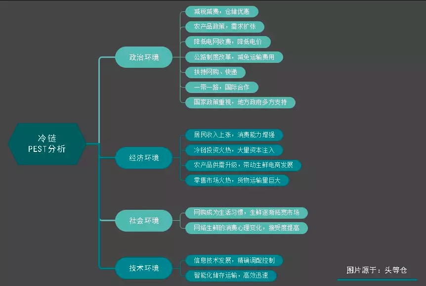 但除此之外冷鏈變熱的因素還有政治、經(jīng)濟、社會以及技術(shù)環(huán)境的變化,如下圖所示,不再贅述。