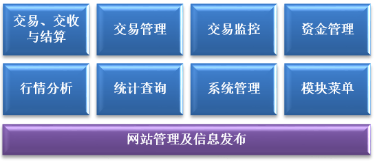 信息平臺為買賣雙方會員的委托提供一個互聯網配對的工具,處理電子商務中買賣雙方下單、撤單、成交、結算、交割、處罰等事宜,同時提供銀行轉賬與物流配送服務系統接口,方便參與買賣會員的資金出入和貨物倉儲配送,并向會員及系統管理和使用人員提供當前的行情及其相關結算信息。基本功能模塊如下:
