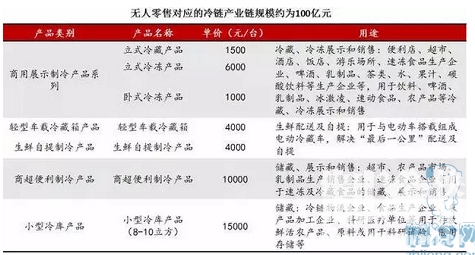 未來,無人零售店將逐步替代傳統便利店,同時,由于成本降低和便利性的提升,無人零售店的鋪設規模可能遠超傳統便利店的數量。保守預計未來十年,無人零售店新增20萬家,參考占地15平米的繽果盒子10萬元造價,無人零售店的投資額將達200億元。假設每個無人零售店配置5-10臺商用冷鏈產品設施,無人零售店對于商用冷鏈終端設施的新增需求就可達到100-200萬臺;如果每臺冷鏈產品設施單價5,000元,則無人零售店對應的冷鏈產業鏈規模將達到50-100億元。
