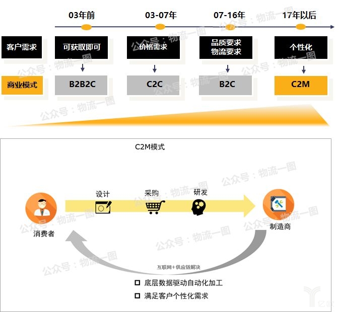 除了線上潛力瓶頸外,新零售很重要的一個內(nèi)生力量是消費者新的需求倒逼商業(yè)模式升級:隨著消費升級,客戶需求越來越多,要求也越來越高,從C2C電商滿足消費者價格需求,到B2C電商滿足消費者商品及物流品質(zhì)的需求,到現(xiàn)在消費者對商品個性化的新需求,催生出了C2M商業(yè)模式(消費者畫像推動產(chǎn)品研發(fā)和生產(chǎn)):