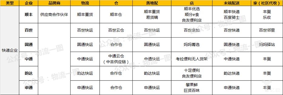 ①門店布局:順豐推出順豐優(yōu)選,百世為百世店加,圓通試水生鮮門店媽媽菁選,申通四川鋪點巨賢百味,而中通和韻達(dá)則選擇與無人貨架或便利店合作。