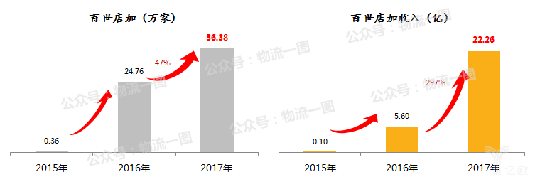 以物流為支撐構(gòu)建的B2B電子商務(wù)平臺,去中介化為品牌商提升覆蓋率和效率,為零售終端提供一站式訂貨服務(wù)和統(tǒng)一倉到店物流配送。2017年百世店加已入駐店鋪36.38萬家,相比2016年增長47%,2017年收入22.26億,相比2016年增長297%。