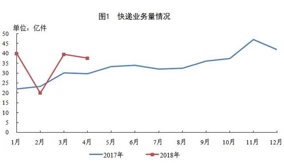 4月,全國(guó)快遞服務(wù)企業(yè)業(yè)務(wù)量完成37.5億件,同比增長(zhǎng)25.8%;業(yè)務(wù)收入完成467.2億元,同比增長(zhǎng)26.5%。