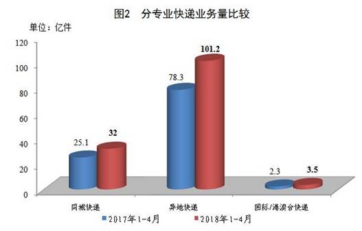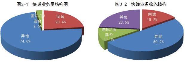 1-4月,同城、異地、國(guó)際/港澳臺(tái)快遞業(yè)務(wù)量分別占全部快遞業(yè)務(wù)量的23.4%、74%和2.6%;業(yè)務(wù)收入分別占全部快遞收入的15.2%、50.2%和11.1%。與去年同期相比,同城快遞業(yè)務(wù)量的比重下降0.4個(gè)百分點(diǎn),異地快遞業(yè)務(wù)量的比重基本持平,國(guó)際/港澳臺(tái)業(yè)務(wù)量的比重上升0.4個(gè)百分點(diǎn)。