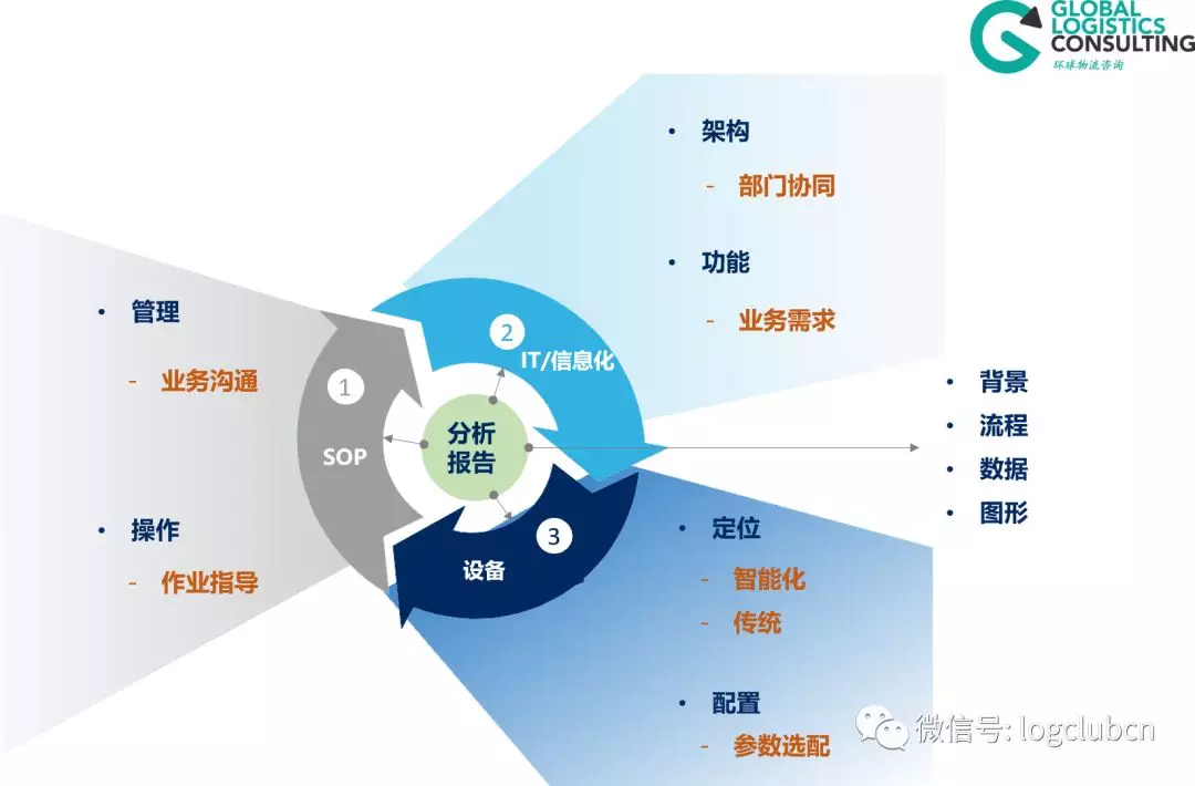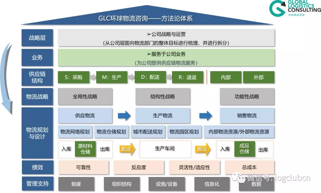 對于在整個房子的支撐層面里,可以將規劃方案里面實施層面的內容放進去,比如需要什么樣的設備支持、什么樣的信息化支持以及什么樣的標準化運作程序支持等。當然,這里的支持并不是一個籠統的概念,而是通過充分的分析,確定了具體的流程配置后才去構建的這些支持實施的模塊。在我們的方法里,把流程作了詳細的拆分,基本上大部分的物流活動都放到了不同環節的流程里面。規劃的房子構建完成后,對于整個規劃方案的結構也就基本清晰,一目了然,既方便團隊和客戶溝通,也方便在后續進行更加深入的分析或者是規劃周期內發生了局部需求改變后的模型修正。