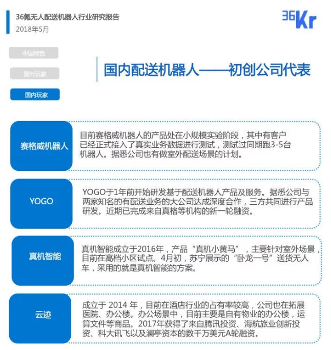 2017年底深蘭、云跡、Segway Robotics等初創(chuàng)公司相繼展示了無(wú)人售貨機(jī)器人Demo,其實(shí)質(zhì)也是室內(nèi)配送機(jī)器人的一種。近期業(yè)內(nèi)傳聞稱(chēng),YOGO獲得了新一輪融資,其中包括了真格歷史上最大的一筆投資,做的也是室內(nèi)配送的方向。真機(jī)智能的室外配送機(jī)器人也已在高檔物業(yè)試點(diǎn)。