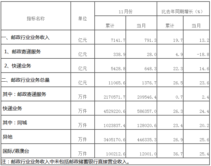 1-11月份,郵政行業(yè)業(yè)務(wù)收入(不包括郵政儲蓄銀行直接營業(yè)收入)累計完成7141.7億元,同比增長19.7%;業(yè)務(wù)總量累計完成11065.6億元,同比增長26.5%。