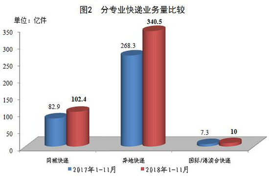 1-11月,同城、異地、國際/港澳臺快遞業(yè)務(wù)量分別占全部快遞業(yè)務(wù)量的22.6%、75.2%和2.2%;業(yè)務(wù)收入分別占全部快遞收入的15.1%、51.3%和9.8%。與去年同期相比,同城快遞業(yè)務(wù)量的比重下降0.5個百分點,異地快遞業(yè)務(wù)量的比重上升0.4個百分點,國際/港澳臺業(yè)務(wù)量的比重上升0.1個百分點。