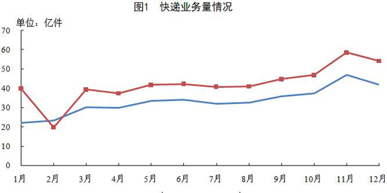 12月份,全國(guó)快遞服務(wù)企業(yè)業(yè)務(wù)量完成54.2億件,同比增長(zhǎng)29%;業(yè)務(wù)收入完成609.6億元,同比增長(zhǎng)17.3%。