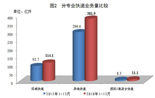 2018年,全國(guó)快遞服務(wù)企業(yè)業(yè)務(wù)量累計(jì)完成507.1億件,同比增長(zhǎng)26.6%;業(yè)務(wù)收入累計(jì)完成6038.4億元,同比增長(zhǎng)21.8%。其中,同城業(yè)務(wù)量累計(jì)完成114.1億件,同比增長(zhǎng)23.1%;異地業(yè)務(wù)量累計(jì)完成381.9億件,同比增長(zhǎng)27.5%;國(guó)際/港澳臺(tái)業(yè)務(wù)量累計(jì)完成11.1億件,同比增長(zhǎng)34%。