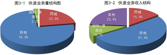2018年,同城、異地、國(guó)際/港澳臺(tái)快遞業(yè)務(wù)量分別占全部快遞業(yè)務(wù)量的22.5%、75.3%和2.2%;業(yè)務(wù)收入分別占全部快遞收入的15%、51.4%和9.7%。與去年同期相比,同城快遞業(yè)務(wù)量的比重下降0.6個(gè)百分點(diǎn),異地快遞業(yè)務(wù)量的比重上升0.5個(gè)百分點(diǎn),國(guó)際/港澳臺(tái)業(yè)務(wù)量的比重上升0.1個(gè)百分點(diǎn)。