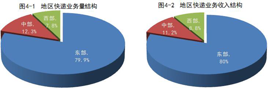 2018年,東、中、西部地區(qū)快遞業(yè)務(wù)量比重分別為79.9%、12.3%和7.8%,業(yè)務(wù)收入比重分別為80%、11.2%和8.8%。與去年同期相比,東部地區(qū)快遞業(yè)務(wù)量比重下降1.2個(gè)百分點(diǎn), 快遞業(yè)務(wù)收入比重下降0.9個(gè)百分點(diǎn);中部地區(qū)快遞業(yè)務(wù)量比重上升0.7百分點(diǎn), 快遞業(yè)務(wù)收入比重上升0.4個(gè)百分點(diǎn);西部地區(qū)快遞業(yè)務(wù)量比重和快遞業(yè)務(wù)收入比重均上升0.5個(gè)百分點(diǎn)。