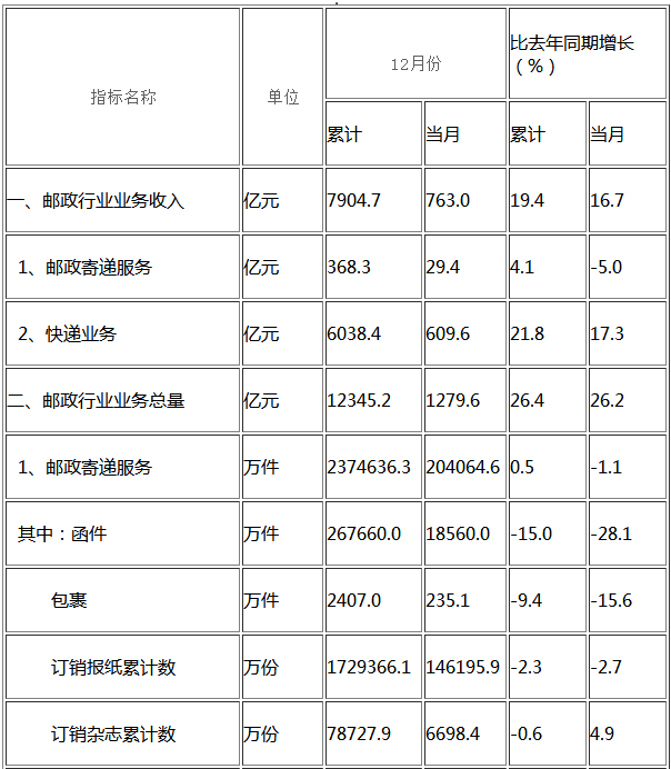 12月份,全行業(yè)業(yè)務(wù)收入完成763億元,同比增長(zhǎng)16.7%;業(yè)務(wù)總量完成1279.6億元,同比增長(zhǎng)26.2%。