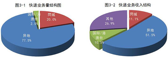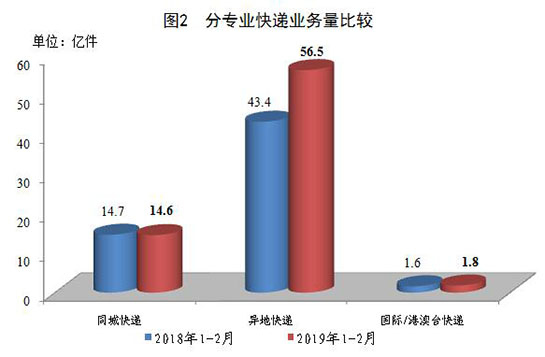 1-2月,同城、異地、國(guó)際/港澳臺(tái)快遞業(yè)務(wù)量分別占全部快遞業(yè)務(wù)量的20%、77.5%和2.5%;業(yè)務(wù)收入分別占全部快遞收入的11.1%、51.5%和10.5%。與去年同期相比,同城快遞業(yè)務(wù)量的比重下降4.6個(gè)百分點(diǎn),異地快遞業(yè)務(wù)量的比重上升4.8個(gè)百分點(diǎn),國(guó)際/港澳臺(tái)業(yè)務(wù)量的比重下降0.2個(gè)百分點(diǎn)。