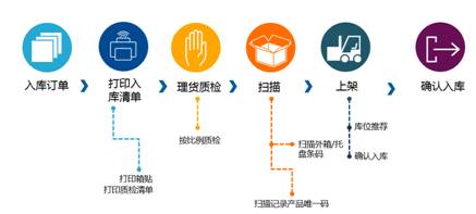 入庫理貨環節:通過掃描貨品條碼,校驗入庫貨品是否與訂單相符,降低人工清點的差錯率。以下為應用企業典型客戶的入庫流程:
