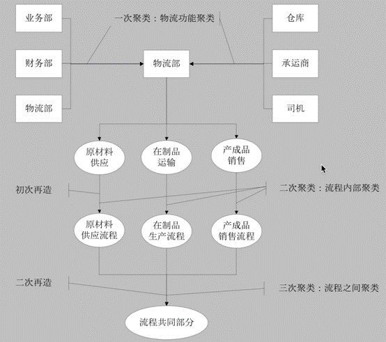 第二次聚類在三個環節各自的內部進行,即對供應過程中各種原材料供應流程進行統一,對生產過程在制品運輸流程進行統一,對銷售過程的各產成品銷售流程進行統一,這就形成了供、產、銷的基本業務流程。物流部門將原本分布在各部門的物流功能進行綜合管理,首先要對現有業務流程進行初次再造,即按照新的職能集中模式,在物流部內部進行工作安排,設置好物流部與外界的流程接口。