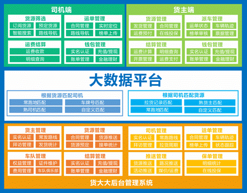 在基于無車承運(yùn)人的貨主和司機(jī)精細(xì)化管理的基礎(chǔ)上,貨大大為司機(jī)和貨主提供了運(yùn)輸業(yè)務(wù)一站式服務(wù),逐步建立和完善基于平臺的生態(tài)體系,如下圖所示。