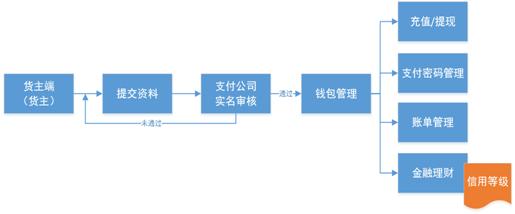 包含賬戶認(rèn)證、充值、支付、提現(xiàn)、支付密碼管理、賬單管理、金融理財?shù)裙δ埽轿槐Wo(hù)貨主的資金安全,并且為其提供現(xiàn)金貸等產(chǎn)品,平臺依據(jù)大數(shù)據(jù)(貨主的發(fā)貨記錄、支付記錄、錢包記錄、誠信體系評分),自動生成用戶畫像,建立用戶信用等級,給予20萬-100萬不等的金融貸款,幫助貨主解決短期資金周轉(zhuǎn)不開的痛點(diǎn)。流程圖如下所示: