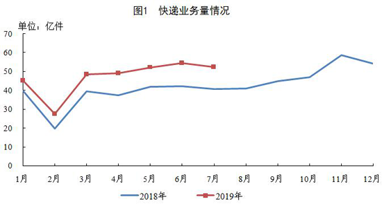 7月份,全國快遞服務企業業務量完成52.5億件,同比增長28.6%;業務收入完成608.4億元,同比增長26.3%。
