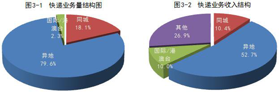 1-7月份,同城、異地、國際/港澳臺快遞業務量分別占全部快遞業務量的18.1%、79.6%和2.3%;業務收入分別占全部快遞收入的10.4%、52.7%和10%。與去年同期相比,同城快遞業務量的比重下降4.9個百分點,異地快遞業務量的比重上升4.9個百分點,國際/港澳臺業務量的比重基本持平。