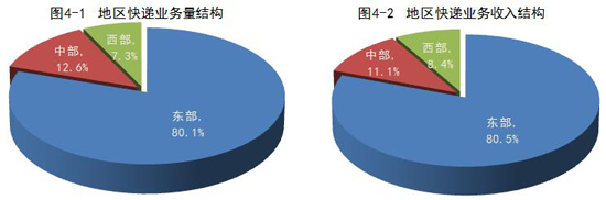 1-7月份,東、中、西部地區快遞業務量比重分別為80.1%、12.6%和7.3%,業務收入比重分別為80.5%、11.1%和8.4%。與去年同期相比,東部地區快遞業務量比重下降0.2個百分點, 快遞業務收入上升0.2個百分點;中部地區快遞業務量比重上升0.6個百分點, 快遞業務收入比重基本持平;西部地區快遞業務量比重下降0.4個百分點,快遞業務收入比重下降0.2個百分點。
